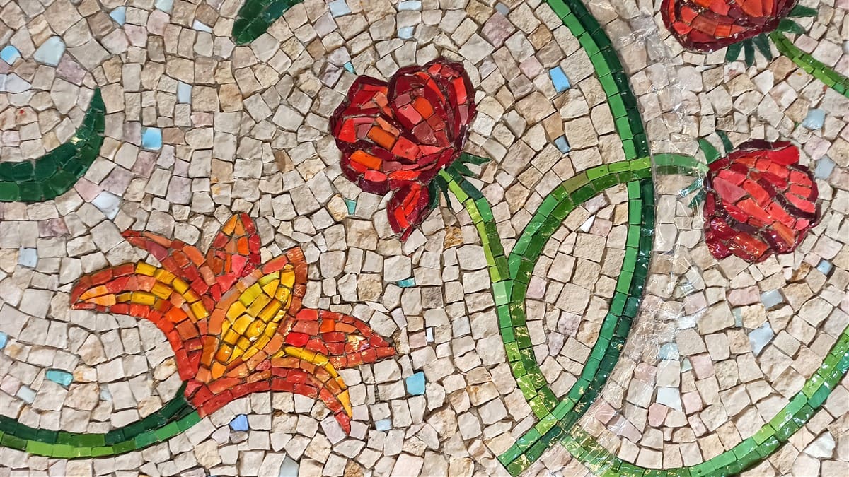 Mozaika o velikosti 4,5 m2 je skládaná z mozaikových kostek o velikosti přibližně 1cm2. Mozaika je provedena klasickým způsobem, který se nezměnil po staletí. Kamenné a skleněné mozaikové kostky se sekají ostrým kladivem na utínce, poté se ručně štípají speciálními mozaikářskými kleštěmi. Na jeden metr čtvereční se zpracuje přibližně 15 kg materiálu.