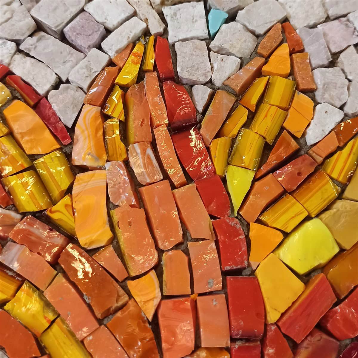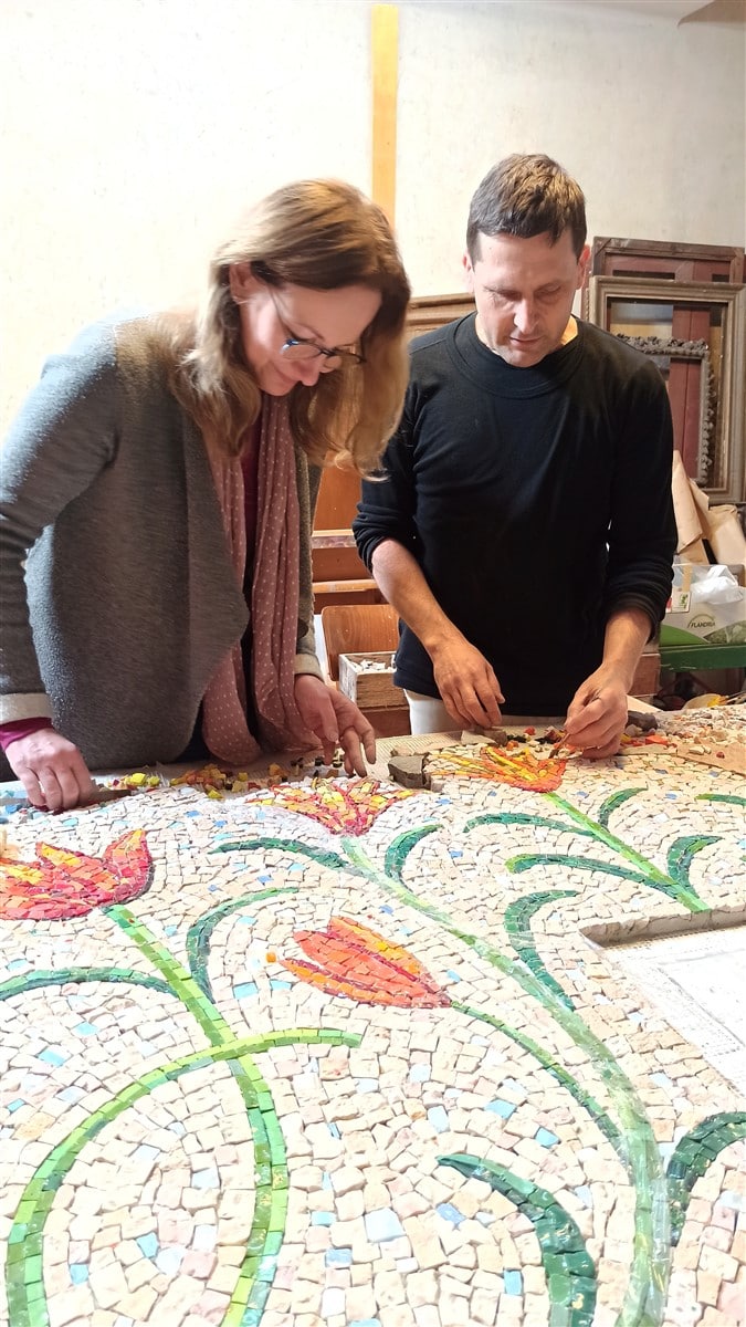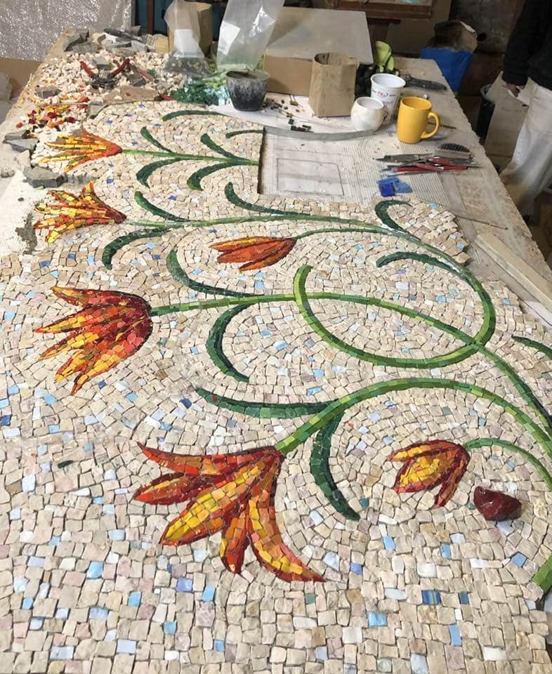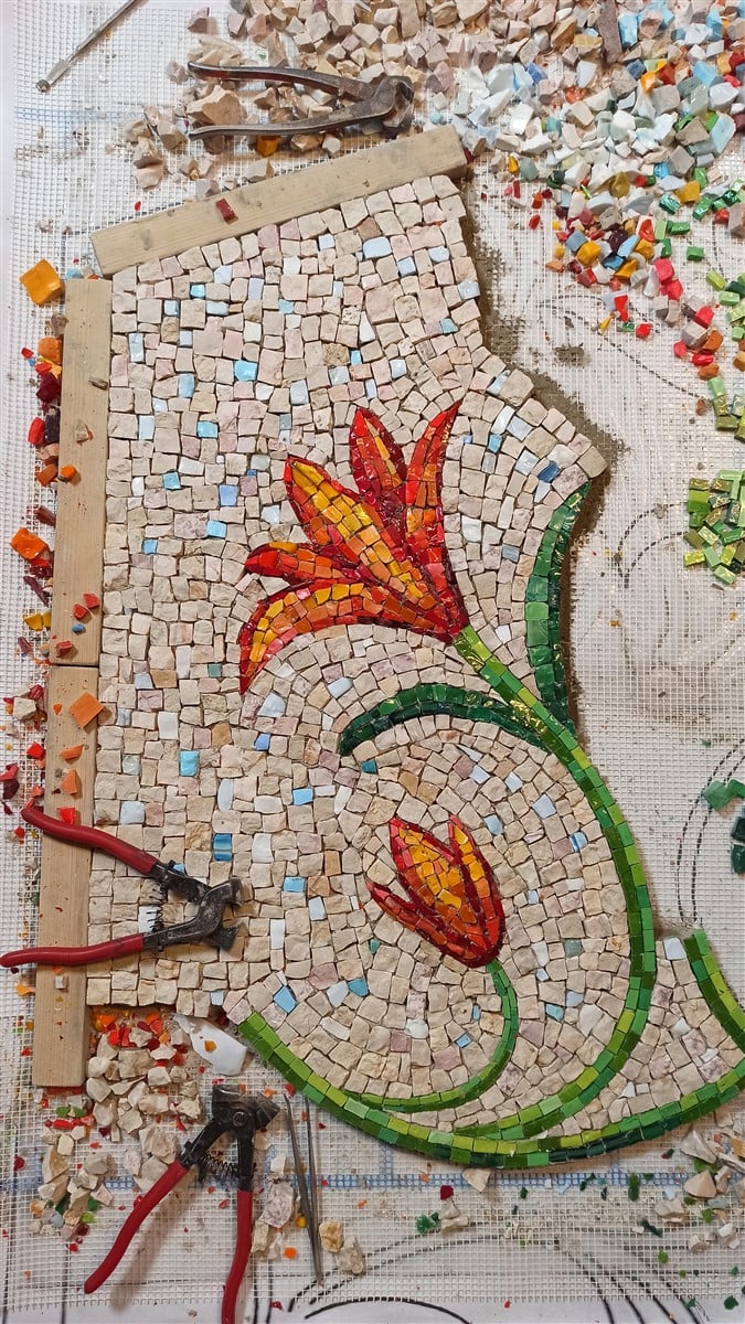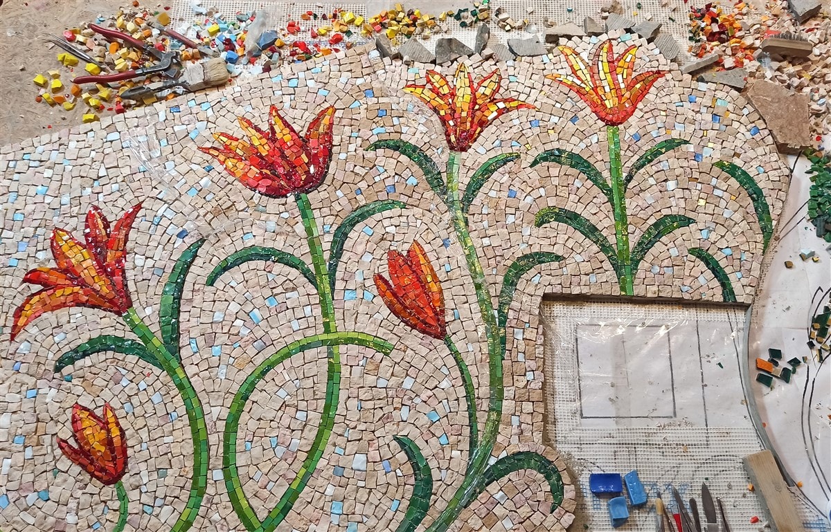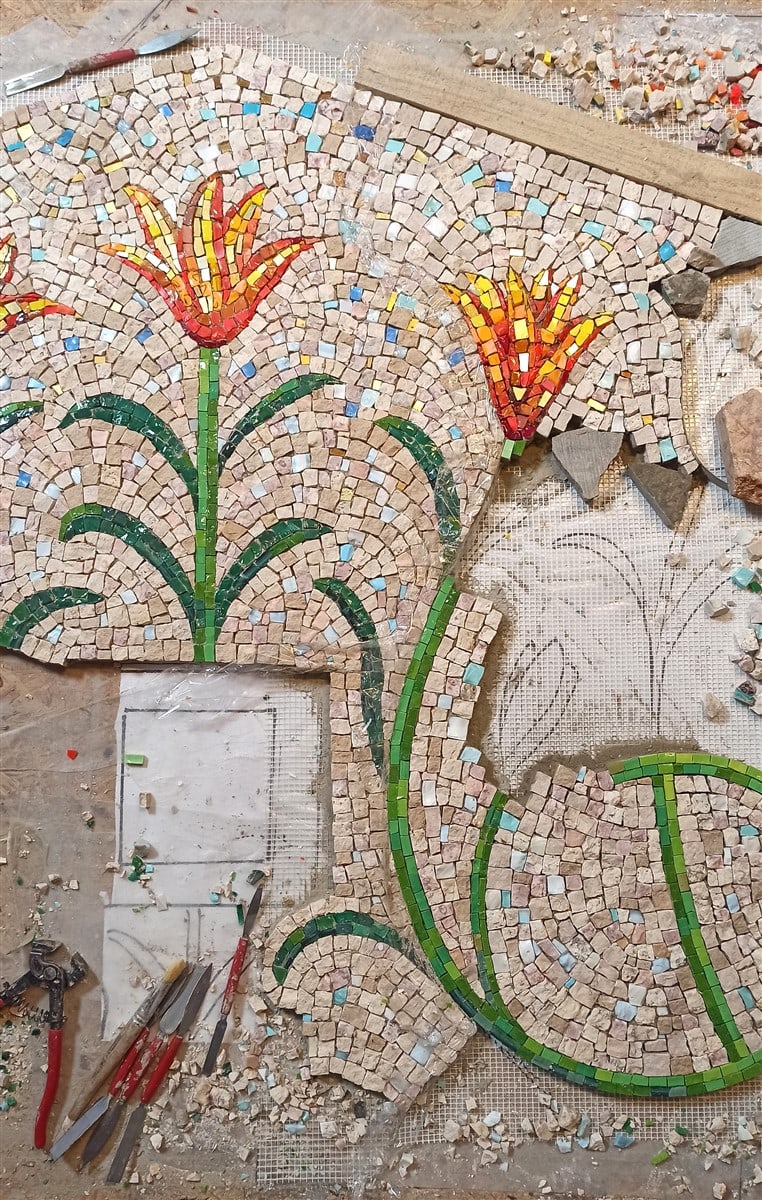 Na mozaiku autoři použili kombinaci ručně štípaného kamene a mozaikového skla, které se do 90. let tavilo pro potřeby Uměleckých řemesel. „Použili jsme italské i české mozaikové sklo, které se u nás tavilo od 30. let. Na zlaté lilie v horní části mozaiky jsme použili italské skleněné mozaikové kostky se zatavenou zlatou fólií. Historický skleněný materiál nám poskytla Jana Nováčková z pozůstalosti svého otce, mozaikáře Františka Tesaře, který vedl mozaikářskou UŘ dílnu od 60. let. Dnes už se u nás mozaikové sklo nevyrábí.“ Říká Petr Hampl.