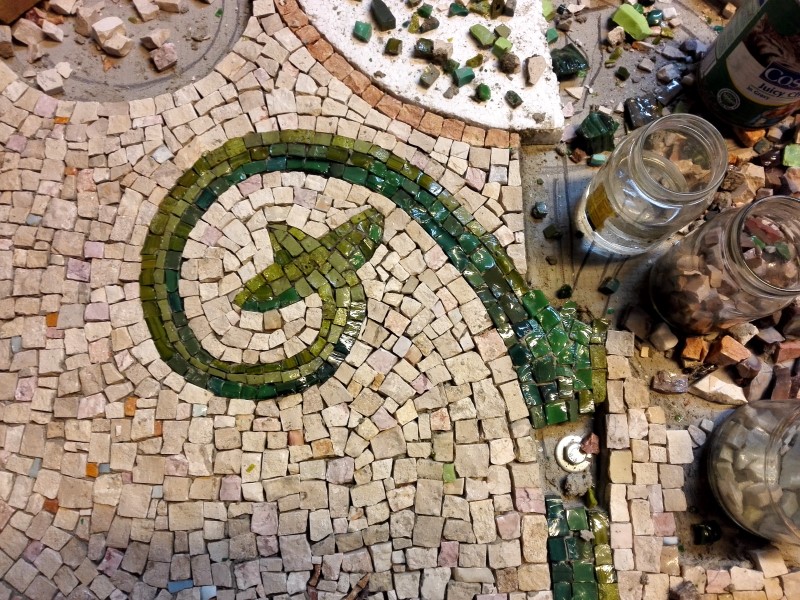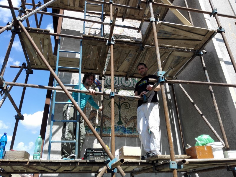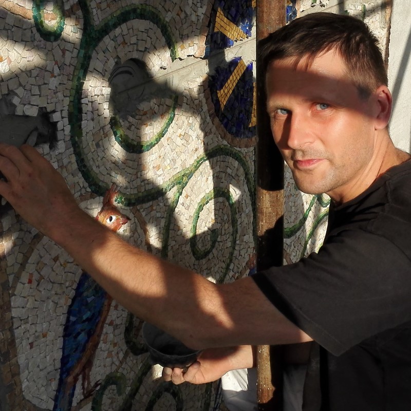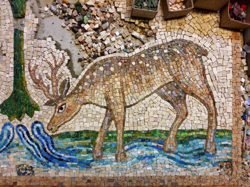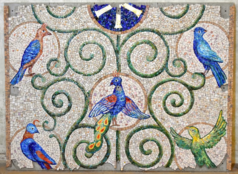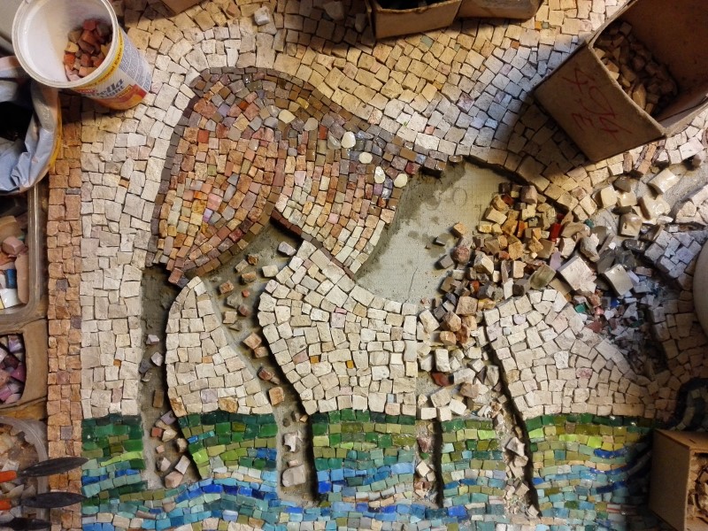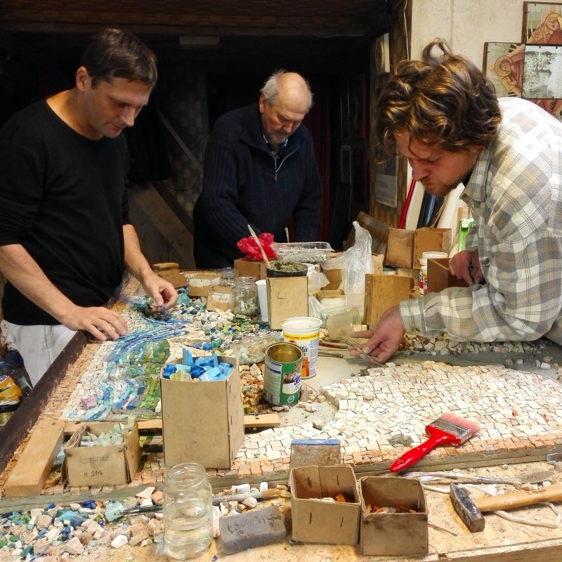 S prací na mozaice začali autoři v lednu tohoto roku. Mozaika o velikosti přes 6m2 a je skládaná z mozaikových kostek o velikosti přibližně 1cm2. Mozaika je provedena klasickým způsobem, který se nezměnil po staletí. Kamenné a skleněné mozaikové kostky se sekají ostrým kladivem na utínce, poté se ručně štípají speciálními mozaikářskými kleštěmi. Na