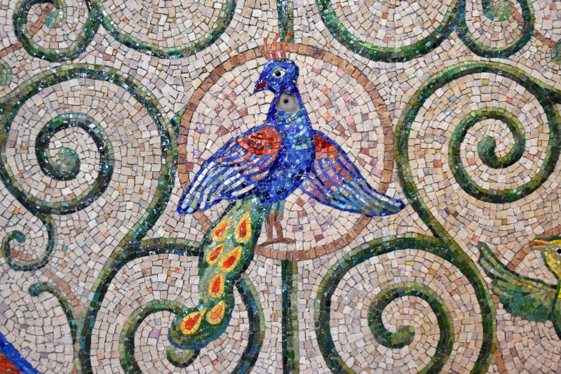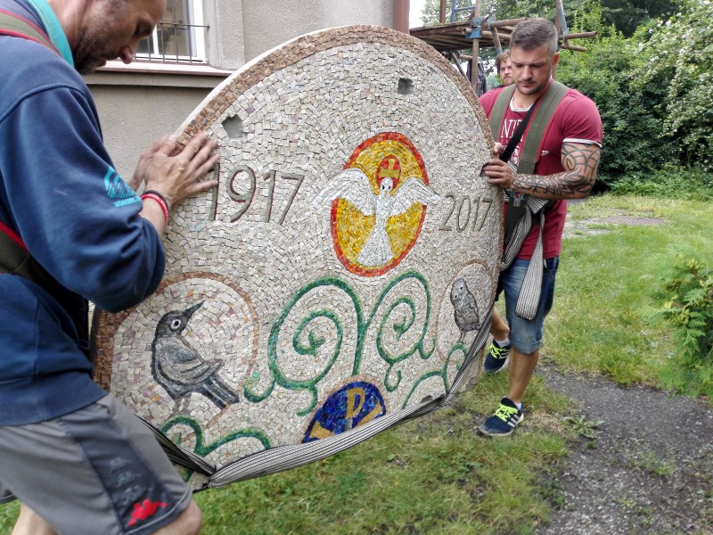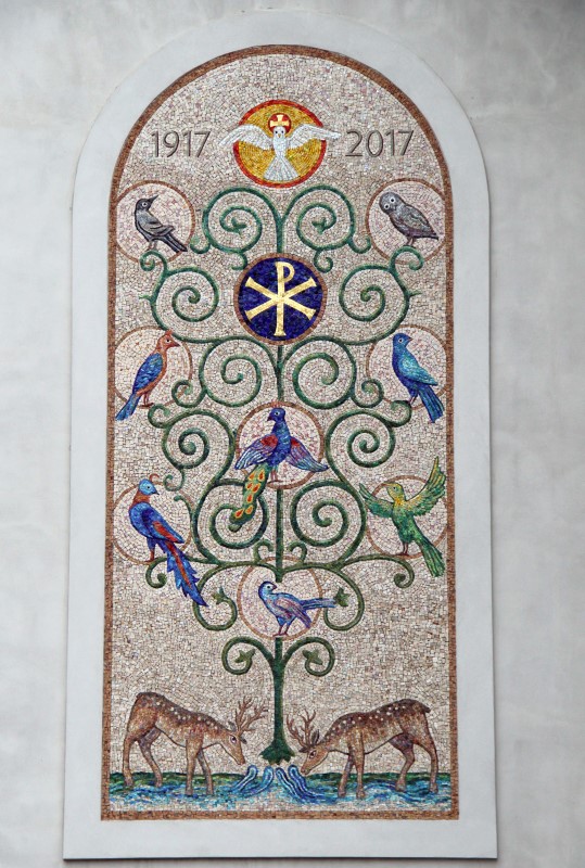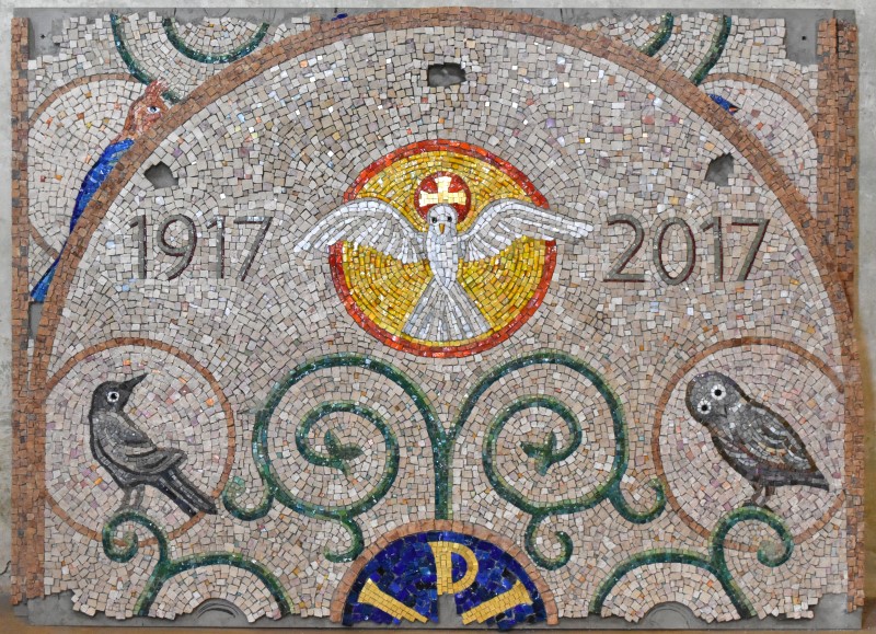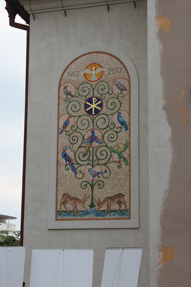 Kombinovaná mozaika z ručně štípaných kamenných a skleněných mozaikových kostek je zhotovena ke stému výročí založení farnosti v Radotíně.