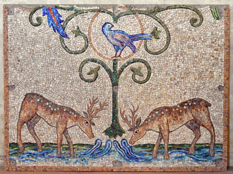 Motivem mozaiky je strom života. Inspirací byla autorovi mozaika z 12. století, která se nachází v apsidě baziliky Sv. Klementa v Římě. Na mozaice s Petrem Hamplem spolupracuje Jan Lhoták a František Tesař, mistr uměleckého řemesla, mozaikář, který vedl od 60. let mozaikářskou dílnu Uměleckých řemesel.