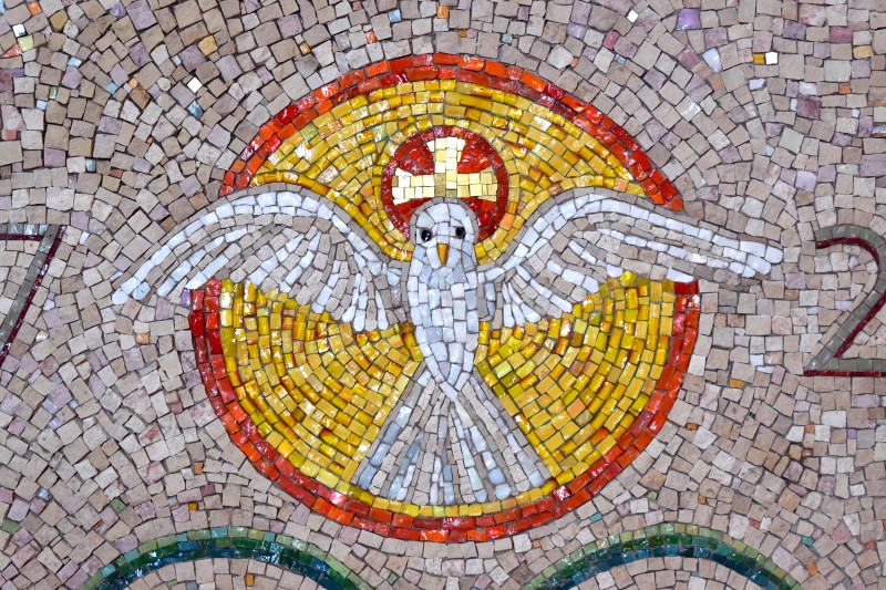 Na mozaiku autoři použili kombinaci ručně štípaného kamene a mozaikového skla, které se u nás kdysi tavilo pro potřeby Uměleckých řemesel. „Použili jsme také italské mozaikové kostky i české mozaikové sklo z 30. let, které napodobovalo klasický italský materiál. Na Christogram a zlatý kříž nad hlavičkou holubice, znázorňující Ducha Svatého jsme použili italské skleněné mozaikové kostky se zatavenou zlatou fólií. Historický skleněný materiál nám poskytl ze svých zásob František Tesař. Dnes už se u nás mozaikové sklo nevyrábí.“ Říká Petr Hampl.