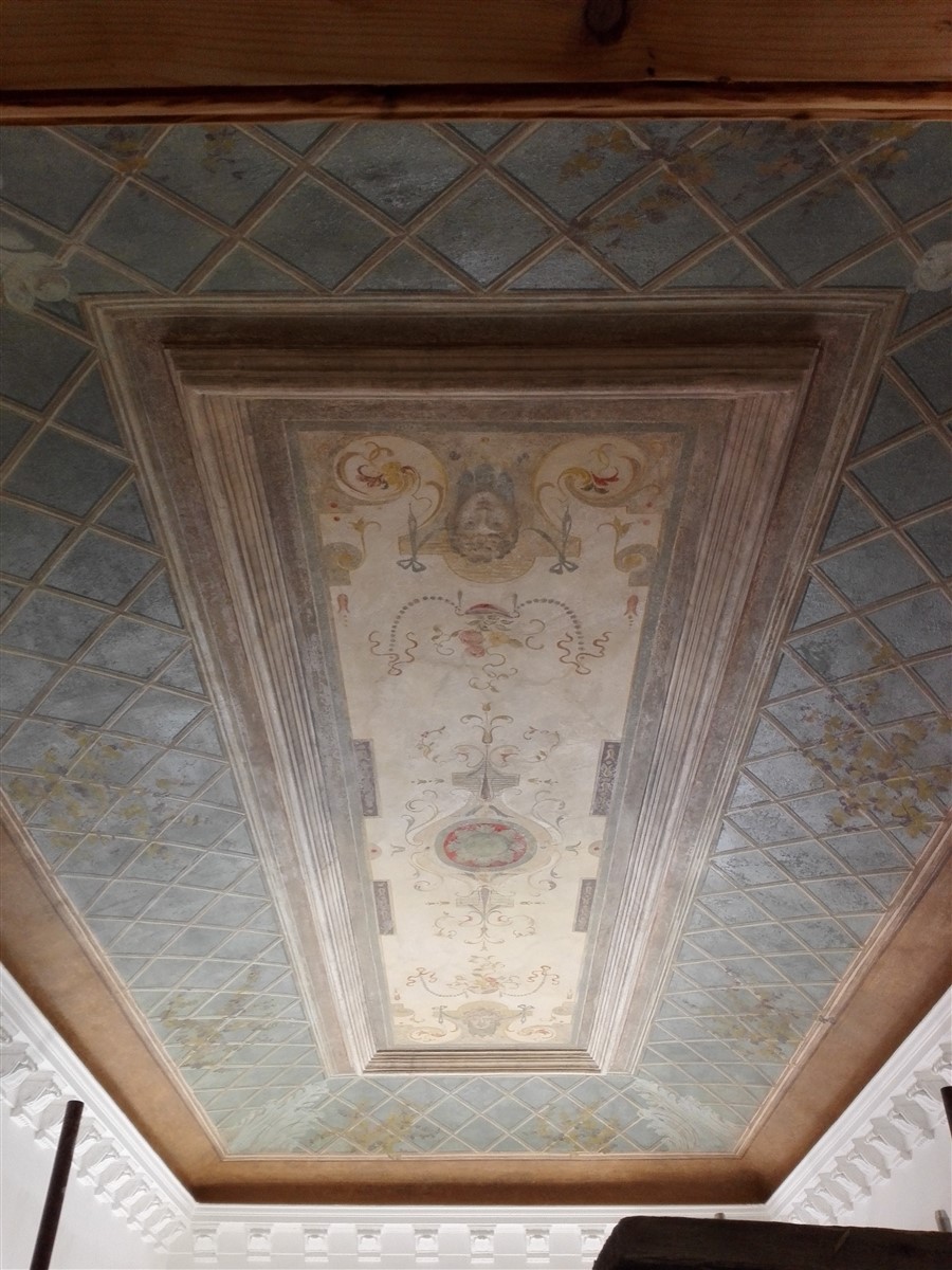 Malba po obvodu centrálního zrcadla představuje iluzivní geometrické členění mřížováním, které je doplněno rostlinným motivem. Malbu v zrcadle tvoří rozeta kolem centrálního osvětlení, rámování po obvodu zrcadla a další dekorativní prvky se dochovaly pouze ve fragmentu.